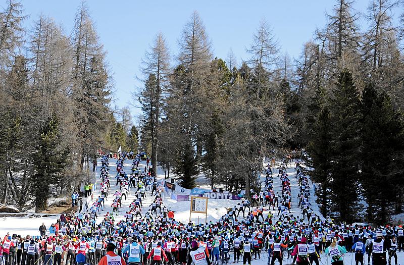 More than 13.000 skiers have been standing at the starting line this morning at 8:30 to ski the 49th edition of the Engadin Skimarathon. Among the thousands of popular skiers also a bunch of the world’s best cross-country skiers traveled to Maloja in the Swiss Engadin, like the local hero Dario Cologna, the Norwegians Eirik Brandsdal, Anders Gloersen and Mari Eide, just to name a few.