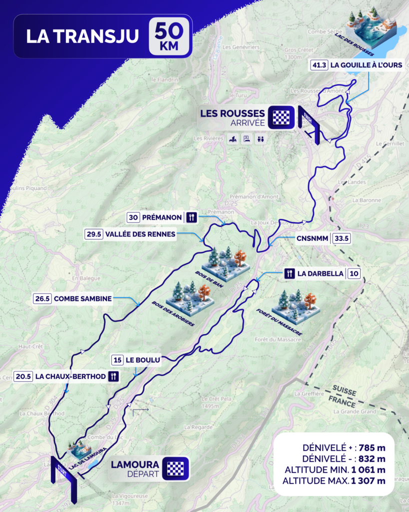 2. An alternative and secure 50 km route, from Lamoura to Les Rousses, already used in the 2023 edition, known for its reliability in terms of snow coverage.